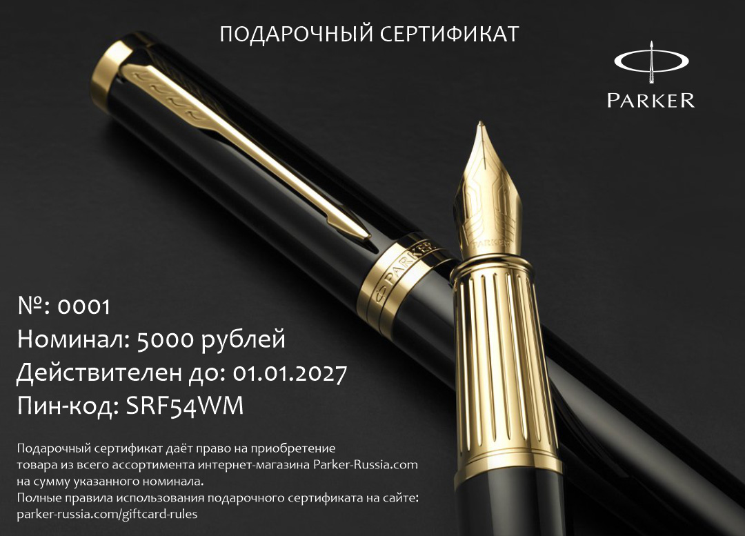Подарочный сертификат Parker 7000 от официального дилера Parker в Волгодонске. Вы можете дополнительно заказать гравировку, которая подчеркнет Вашу оригинальность и придаст памятность статусному подарку. Все ручки Паркер поставляются в фирменном футляре.
